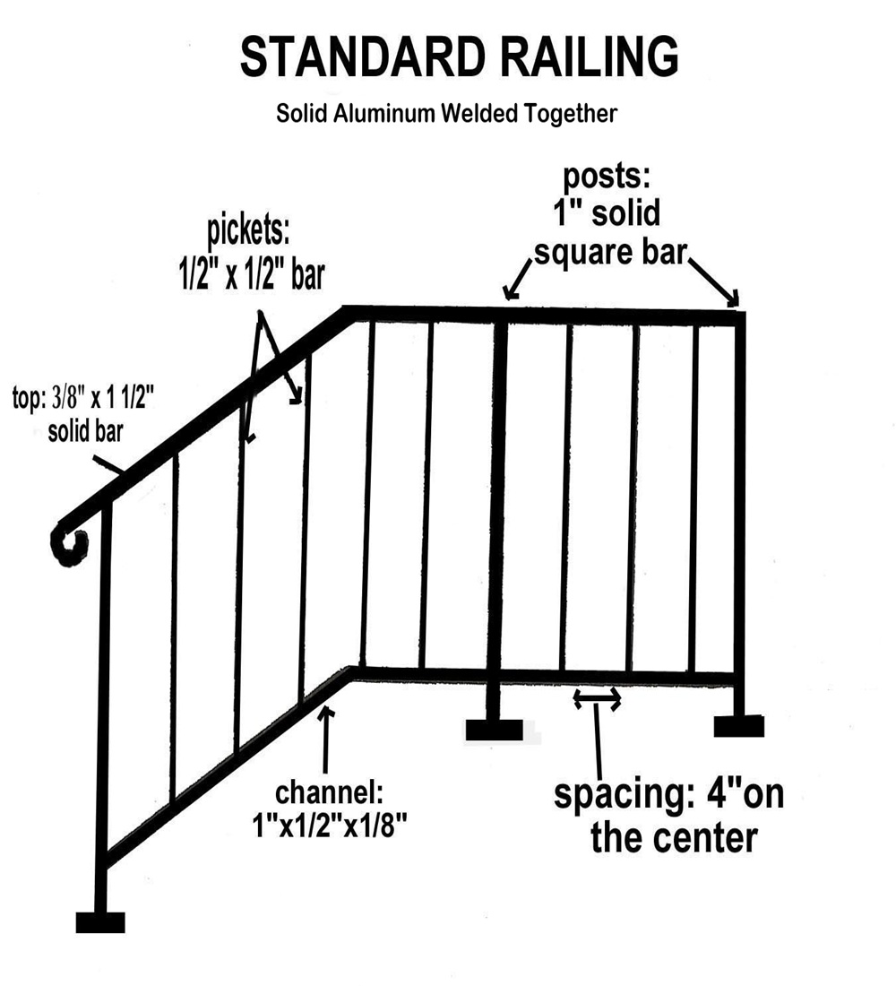 Our stock step railing has a top rail made of 3/8" x 1-1/2" solid bar, posts made of 1" x 1" solid bar, a channel of 1" x 1/2" x 1/8" material, and 1/2" solid pickets that run between the top rail and bottom channel. Step railings can be customized by adding powder coated color, alternating twisted pickets and different top rail styles, to name a few.